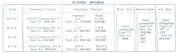 4. JET NEEDLE POSITION. Tuning sequence 2 and 3 will affect carburation up to somewhere over one-quarter throttle, after which the jet needle, which is suspended from the throttle valve, comes into action and when the throttle is opened further and tests are again made for rich or weak spots, as previously outlined, the needle can be raised to richen or lowered to weaken the mixture, whichever may be found necessary. With these adjustments correctly made, and the main jet size settled, a perfectly progressive mixture will be obtainable from tick-over to full throttle. The jet needles are interchangeable in carburetters type 15 G.P.2 or 10 G.P.2, but longer needles are required for the Type 5 G.P.2 and Type 3 G.P.2.