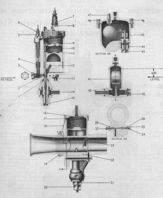 The petrol level in the type 510 float chamber is 640" below the cover joint (see diagram, page 2) and is marked with a raised line on the outside of the body. In positioning the float chamber this line should be on a level with the lowest point of the circular scribe mark on the air jet plug (3).