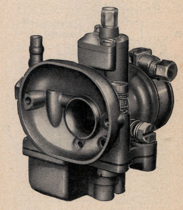 The carburetter atomises the correct amount of petrol with air which is drawn into the engine. A float chamber maintains a constant level of fuel at the jets and cuts off the fuel supply when the engine stops. For cold starting a tickler (21) for flooding is fitted. A throttle valve (5), operated by a cable from the handlebar controls the volume of mixture and, there fore, the engine power. At all openings of the throttle the mixture is automatically correct.
