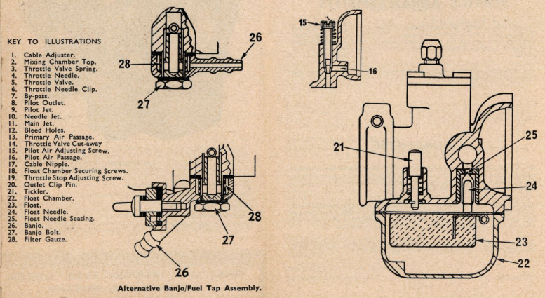 To ensure that fuel is reaching the carburetter, turn off fuel tap, check that filter gauze (28) is clean by removing banjo bolt (27) and banjo (26) (with fuel tap combined on certain models). Before replacement momentarily turn on tap to see that fuel gushes out freely. Petrol pipes with vertical loops cause air locks and should be avoided.